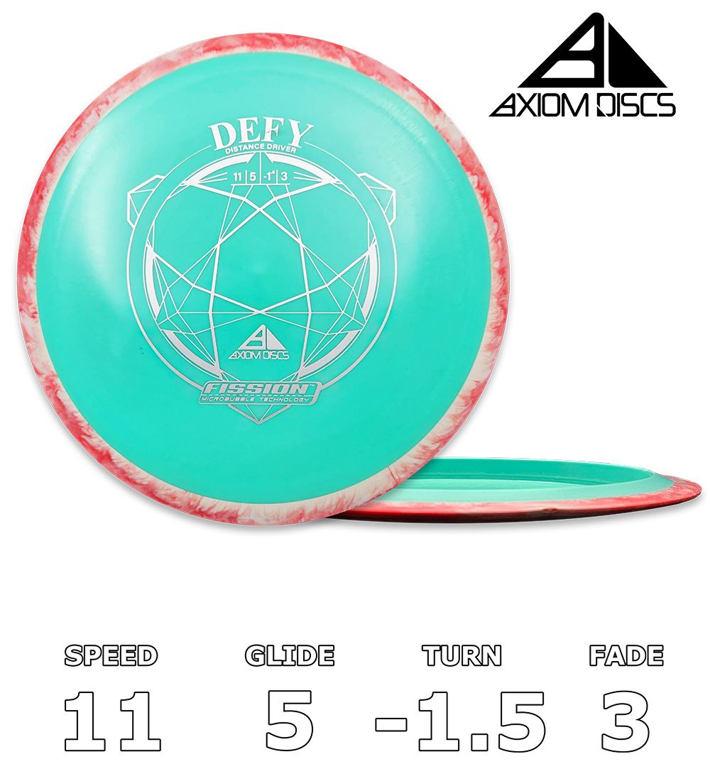 A new introduction to the Fission plastic family is here - the Fission Defy! Debuting as a stable-overstable distance driver, the Defy continues to be a driver you can depend on to not turn away from its flight path. With flight numbers of 11 | 5 | -1.5 | 3, the Defy in Fission plastic is slightly less stable, making it a great choice for easy but reliable distance for all arm speeds. The Fission Defy will still remain the line-locking, forward-finishing driver it’s expected to be, but now - thanks to it being available in lighter weights - more players can enjoy it! Experience the benefits of Fission technology for yourself, and try the Fission Defy today!