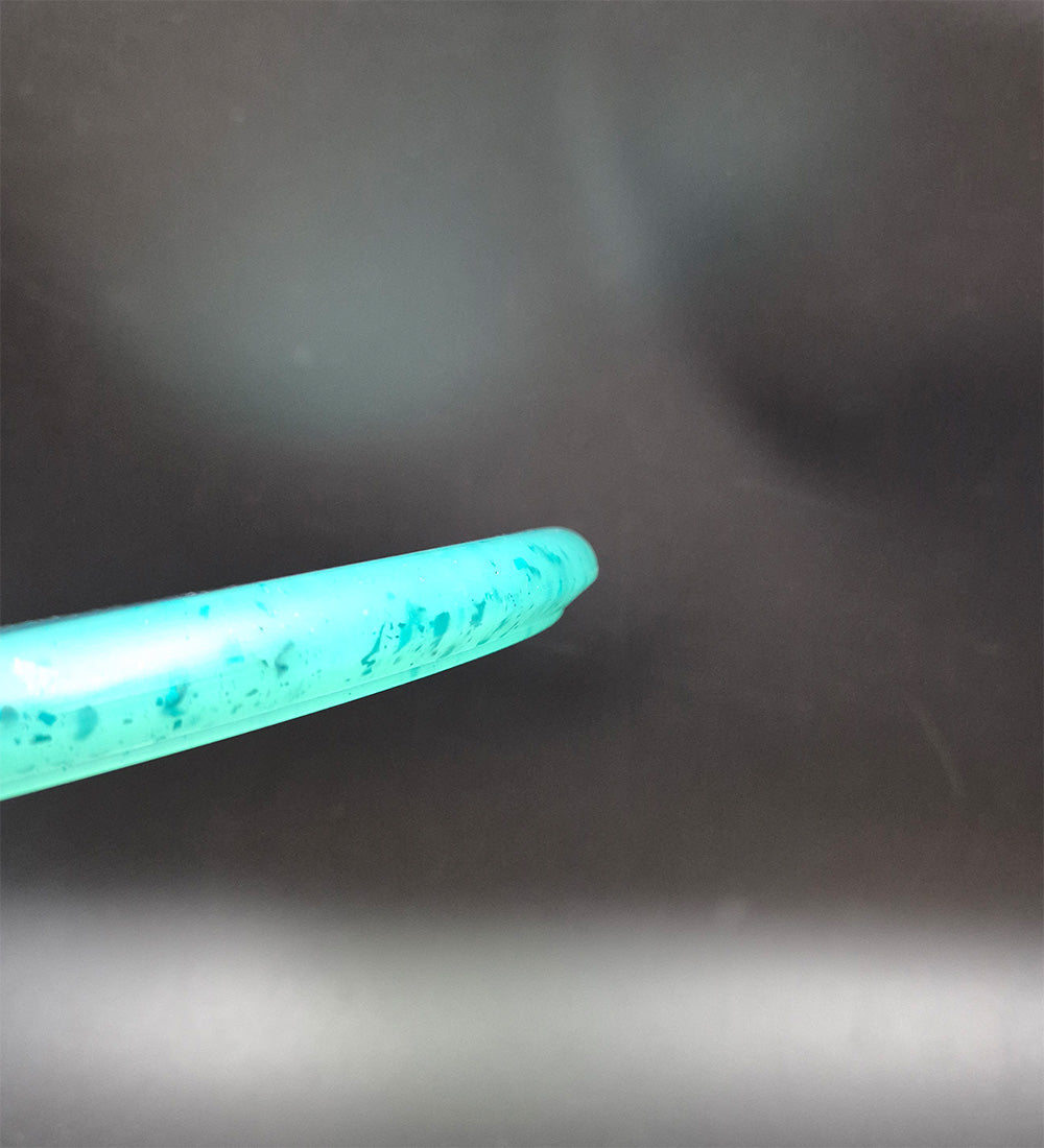 Da vi begyndte at lave diske af genbrugte telefoncovers, bemærkede vi, at designene på coversene skabte "flager", der flød rundt i resten af den 100% genbrugte plastik.