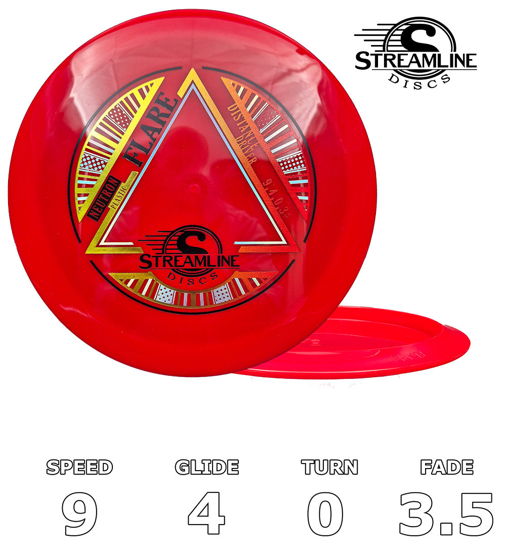 Flare er en overstabil distancedriver fra Streamline og er designet til flyvninger med minimal drejning, der afsluttes med en kraftfuld overstabil finish og et reserveret glide for at forhindre for lange indflyvninger. Flare er i 19 mm Driver-klassen og er den første Streamline Speed 9-disc. En virkelig alsidig disc, uanset om fans leder efter noget, der kan håndtere selv de højeste power-throughs, bekæmpe de stærkeste vinde eller til en bred vifte af utility-slag, kan Flare håndtere dem alle. Streamline Flare brænder klart på banen og kommer til undsætning!