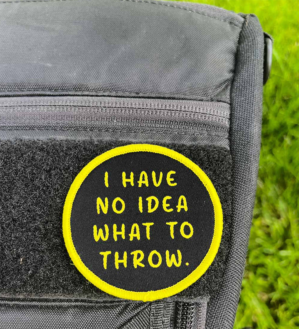 Du står ved din disc og overvejer livet og hvorfor du overhovedet spiller dette spil, mens du tænker for dig selv: "Jeg aner ikke, hvad jeg skal kaste med...". Denne runde velcro-mærke har en limegrøn yderkant med limegrøn tekst i midten. Jeg har ingen idé om, hvad jeg skal kaste med Disc Golf-mærker er slidstærke, vævede velcro- mærker, perfekte til tasker, skjorter, jakker eller hatte.