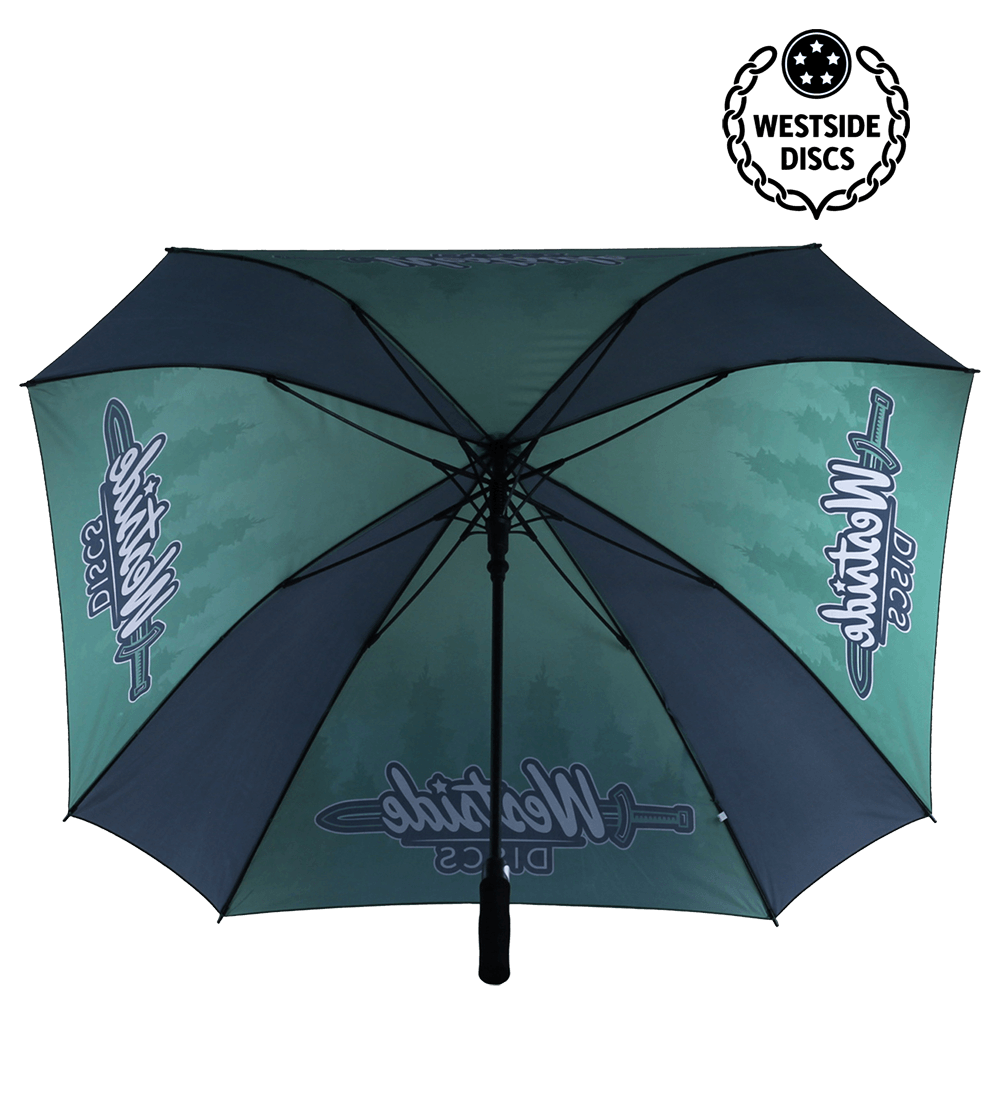 Hvis du vil holde dig tør på regnvejrsdage eller gemme dig i skyggen, har Westside Discs produceret en helt ny 60" firkantet paraply. Et skridsikkert skumhåndtag giver et sikkert greb i alle situationer. Det firkantede design hjælper paraplyen med at holde sig på plads, når den sættes ned, og dækker et større område for at holde alt dit udstyr tørt.