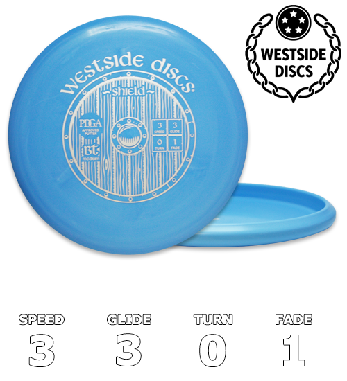 Vores nyeste putter på markedet, Shield, er det næste skridt op fra Swan . Shield er designet med et tacky grip i BT-plast, er lidt tykkere og har en lille kant på kanten. Den holder en stabil linje, når man kaster som en approach, og en lige linje ind i kæderne, når man putter. Westside Shield er en PDGA-godkendt disc.